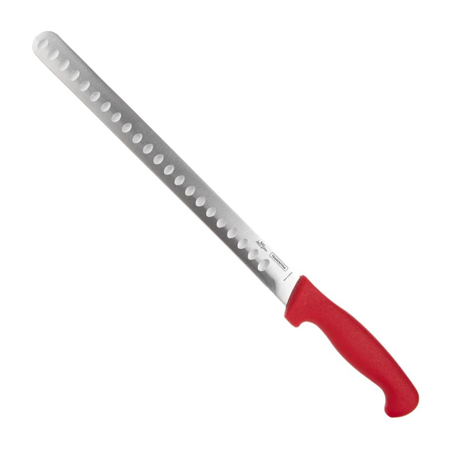 This knife features a sharpened, scalloped blade designed for expertly slicing Brisket, Ham, and Roasts in a single stroke.