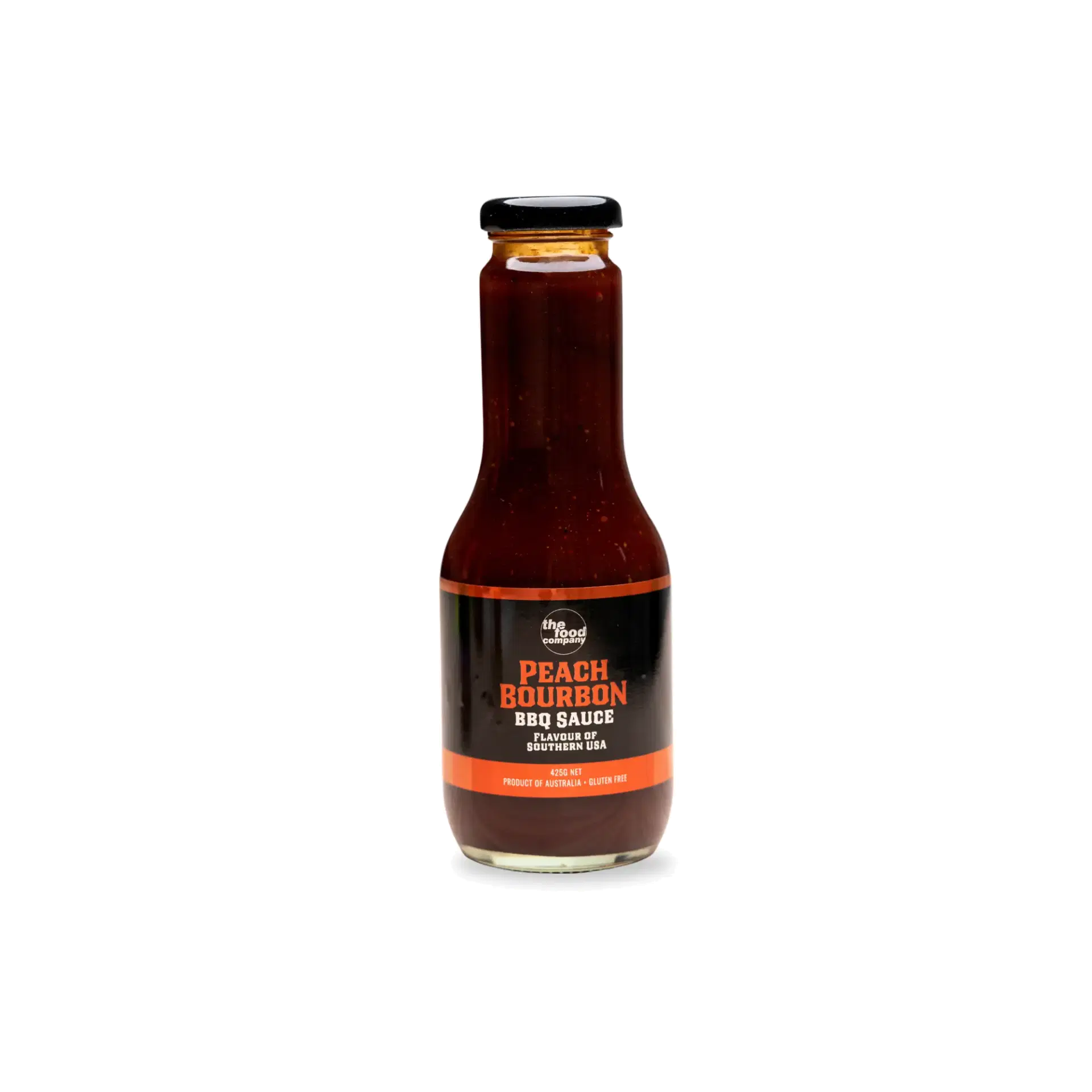 Sugar, Water, Peach (14%), Tomato Paste, Molasses, BBQ spices (thickener 1422, 415) vegetable powders, spices, preservative (202)), Onion, Salt, Vinegar, Lemon Juice, Pepper, Mustard, Bourbon Flavour (1%) Chilli, Modified Starch (1442), Garlic, Natural Flavour, Caramel colour (150c), Soy Sauce, Acidity Regulator (260), Antioxidant (330)